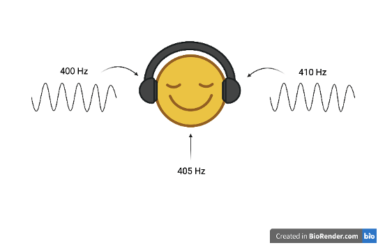 For example, if the left ear registers a tone at 400 Hz and the right ear registers one at 410 Hz, what you actually hear is halfway between the two tones: 405 Hz – the binaural beat (Figure 1) 3,6. Because your brain is trying to interpret these two frequencies, this binaural beat of 405 Hz is considered an illusory tone3,6. Scientists from around the world have shown that in order for a binaural beat to occur, the difference between the two frequencies (e.g., 400 Hz – 410 Hz = 10 Hz) must be small (≤ 30 Hz)7. If the difference is not small ( 30 Hz), your ears will be able to capture the two tones separately and no binaural beat will be perceived6. Will you perceive a binaural beat if you listen to 10 Hz from both ears? No, because a binaural beat is the difference between the two frequencies, which is why it is considered an auditory phenomenon or illusory tone3,4,6!