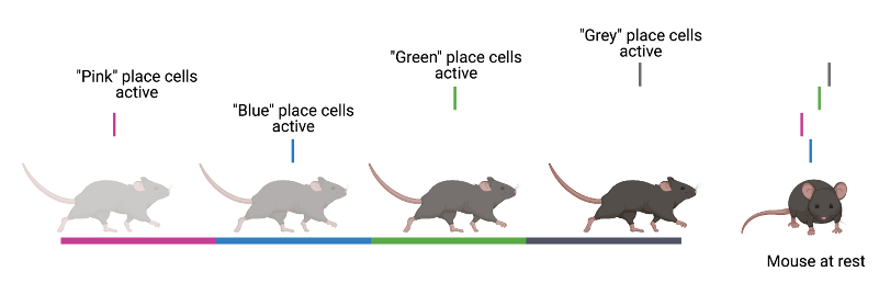Place cells were discovered by recording the activity of single neurons in the hippocampus of rats as they were navigating a box1. The scientists noticed that some neurons would fire every time the animal entered a certain area of the box. Other neurons, on the other hand, would only fire every time the animal entered another area. When summed, it appeared that different sets of neurons were activated as the mouse navigated the entirety of the box. This same pattern was observed in later studies when rats were navigating a linear track (Figure 1)2. In this way, these neurons act as a kind of “internal map”, telling an animal where it is by activating neurons that are specific to that location. This discovery was so significant that the scientists who first described these cells were awarded a Nobel Prize in 20143!