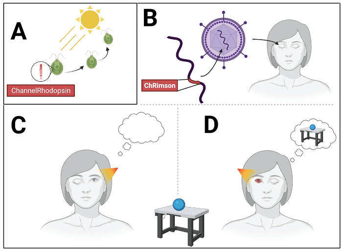 The team used a virus to deliver the gene for an opsin called ChRimson directly to the neurons in one of the patient’s eyes (Figure 1B). ChRimson is a modified form of Channelrhodopsin9. Like Channelrhodopsin, ChRimson is also an excitatory opsin, but while Channelrhodopsin responds to blue light, ChRimson responds to amber light. This wavelength of light is gentler on the human eye, making ChRimson more suitable for patients.