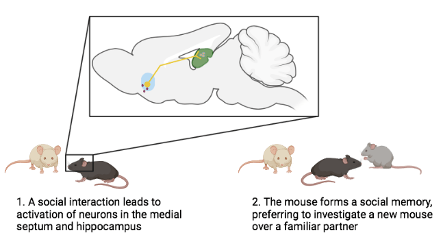 Social memory, unsurprisingly, depends on the brain region most commonly associated with memory, the hippocampus. Specifically, subregions of the hippocampus called dorsal CA2 and ventral CA1 are necessary for mice to remember social partners1,2. The mechanisms by which a social interaction is turned into a social memory, however, hadn’t been well understood. Recently, two studies focused on elucidating this part of the pathway to determine how mice were able to remember their friends1,2.