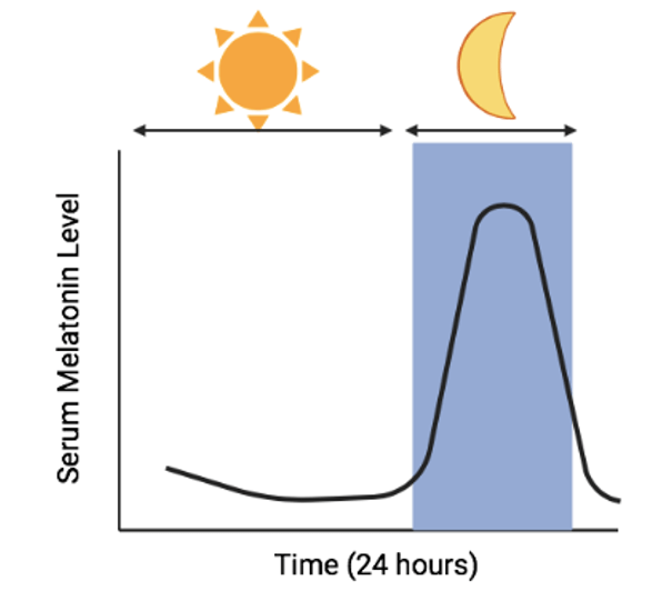 A part of the brain’s hypothalamus called the suprachiasmatic nucleus (SCN) controls circadian rhythms. The SCN is responsive to light entering the eyes, receiving inputs from melanopsin-expressing retinal ganglion cells that are sensitive to blue light in particular. These retinal cells send signals to the SCN via the retinohypothalamic tract, allowing our circadian rhythms to synchronize to the cycles of light and darkness in the environment3. The SCN controls secretion of the hormone melatonin, which is produced in the pineal gland. When light hitting the retina signals the SCN, secretion of melatonin into the body is inhibited, so that during daylight hours we remain awake and alert (Fig 1). Then, as it gets dark outside, the SCN signals for melatonin secretion to begin, helping the brain to wind down and prepare for sleep. This strong relationship between light and the body’s natural production of melatonin is one reason that light from looking at your phone or computer right before bed can make it more difficult to fall asleep. If you do look at screens before bed, wearing glasses that block blue light can help promote normal melatonin release at night by reducing activation of the retinal ganglion cells.
