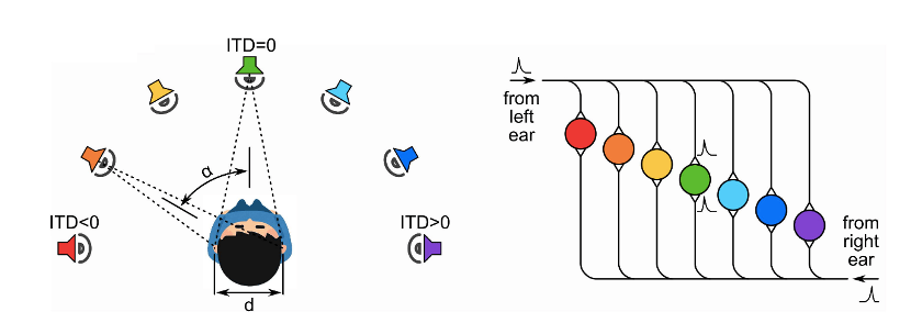 A sound coming from the left will hit the left ear before reaching the right. Neurons responding to the sound on the left side of the head will send a short axon to another area in the left side of the brain, and a really long one to the right side of the brain. When the sound eventually hits the right ear, neurons on the right will likewise send a short axon to the right side of the brain to meet the long one coming from the left, and a long one to the left side of the brain. These axons then meet at ‘coincidence detector’ neurons which will only fire when they receive input from the left and right at the same time. Each coincidence detector neuron can then be thought of as representing a particular sound-to-ear timing difference and subsequently a region in 3D space.1 Combined with many other such neurons and information about sound intensity, they build a whole auditory map of the environment in the owl’s brain. Determining how this information is transmitted throughout the owl’s nervous system has proved invaluable in understanding our own auditory system since many of the principles found in the owl directly translate to other animals and indeed human hearing. For additional reading about the parallels between hearing in bats versus humans, check out this previous article.