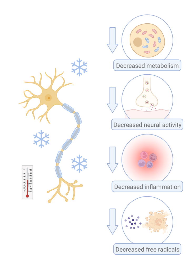 In the same way that you might put an ice pack on a swollen knee after an injury, cold may help dampen the inflammatory process in the brain as well. Cold has been shown to reduce the levels of some chemicals that recruit inflammatory cells to the site of an injury, while increasing the levels of other chemicals that calm down the inflammatory cells.10