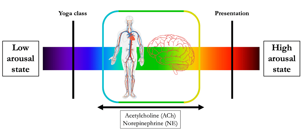 Navigating the diversity of situations in our day-to-day lives involves more than just adjustment of our physical state. For example, as your body prepares you for your important meeting by increasing your heart rate and decreasing your digestion, your brain is making adjustments, too. Fascinatingly, work in neuroscience suggests that these changes in brain state, like changes in physical state, rely on many of the same neurotransmitters, like norepinephrine and acetylcholine.2