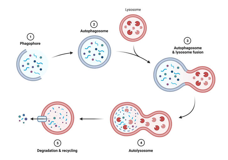 Autophagy is a process that breaks down unneeded proteins and debris in the cell3. Just like a city, cells in your body accumulate trash that needs to be disposed of. The process of cellular cleanup has two main players: an autophagosome which acts like a cell packager and a lysosome which acts like a trash incinerator. During this process, cellular debris is engulfed into an autophagosome (packager) that fuses with a lysosome (trash incinerator). Once together, the digestive enzymes in the lysosome break down debris which can then be released and recycled (figure 1).
