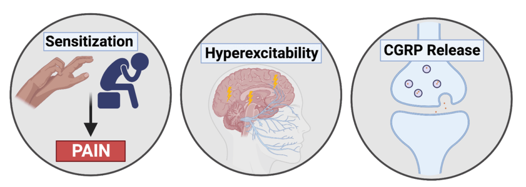 Figure 2. Three contributors to migraine pain: sensitization, hyperexcitability, and CGRP release.