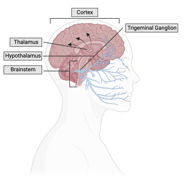 During a migraine, it is thought that the trigeminal ganglion become sensitized, meaning they can activate and send pain signals in response to nonpainful stimuli (Figure 2)3. Trigeminal ganglion sensitivity causes throbbing head pain, and pain felt when coughing or bending over during a migraine. Even though you are not doing anything to cause this pain, the trigeminal ganglion is sensitized and sending pain signals anyway! The sensitized trigeminal ganglion lead to the activation and sensitization of the brainstem, and thalamus10. Sensitization of the brainstem and thalamus contribute to allodynia, perception of pain by something not normally painful, like a gentle touch or glasses resting on your nose. Collectively, the sensitization of the trigeminal ganglion, brainstem, and thalamus play a critical role in migraine pain.