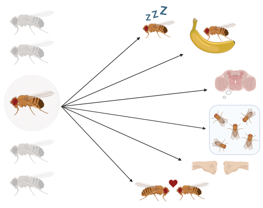 Scientists are working to combine these findings about behavioral changes, mental and physical health, and longevity to understand the biology of social isolation. Studying social isolation faces many ethical concerns due to harmful psychological consequences to the subjects. Animal models have been important in facilitating this understanding of the relationship between the brain and social isolation. The brain regions critical for learning and memory of socially-isolated ants were shown to have developmental impairments compared to their socially-connected peers10. Fruit flies are a commonly used model organism scientists use to understand everything from genes to neural circuits to behavior, and importantly are more flexible in terms of research protocols. Studies using fruit flies have linked social isolation to specific neuronal populations that are involved in complex behaviors like sleep, feeding, aggression, courtship, learning and memory, and sociability11 (Figure 1). A recent study demonstrated that socially isolated fruit flies eat an excessive amount and sleep less following chronic, but not acute, social isolation9. Public health research reports that the duration of loneliness is a stronger predictor of depression than the intensity of loneliness12.