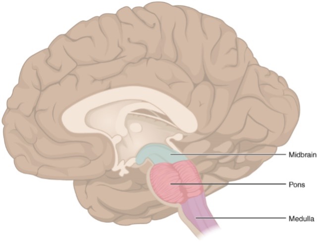 The brainstem is composed of 3 main areas: the medulla, the pons and midbrain, which sit at the base of the skull and function as the first stop in the brain from the spinal cord. Evolutionarily speaking, the brainstem is considered the oldest section of the brain since it developed first to conduct the necessary processes that support life.2 As nervous systems evolved to become more complex, new systems and functions developed on top of the brainstem including the parts of the brain involved in regulating emotions, planning, and complex thought.