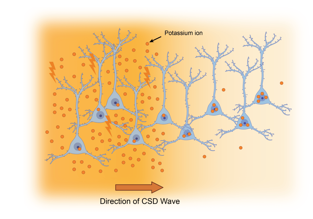 Some evidence suggests that the primary driving force of a CSD are dramatic changes in the amount of potassium ions outside of neurons.1,12 If a neuron opens the channels in its membrane, and there are too many potassium ions outside, none of the potassium ions want to leak out. That means that the neuron becomes highly “active” but cannot return to its resting state. When this happens in many neurons at the same time, it creates a “wave” of simultaneously highly active neurons that travels across the brain.