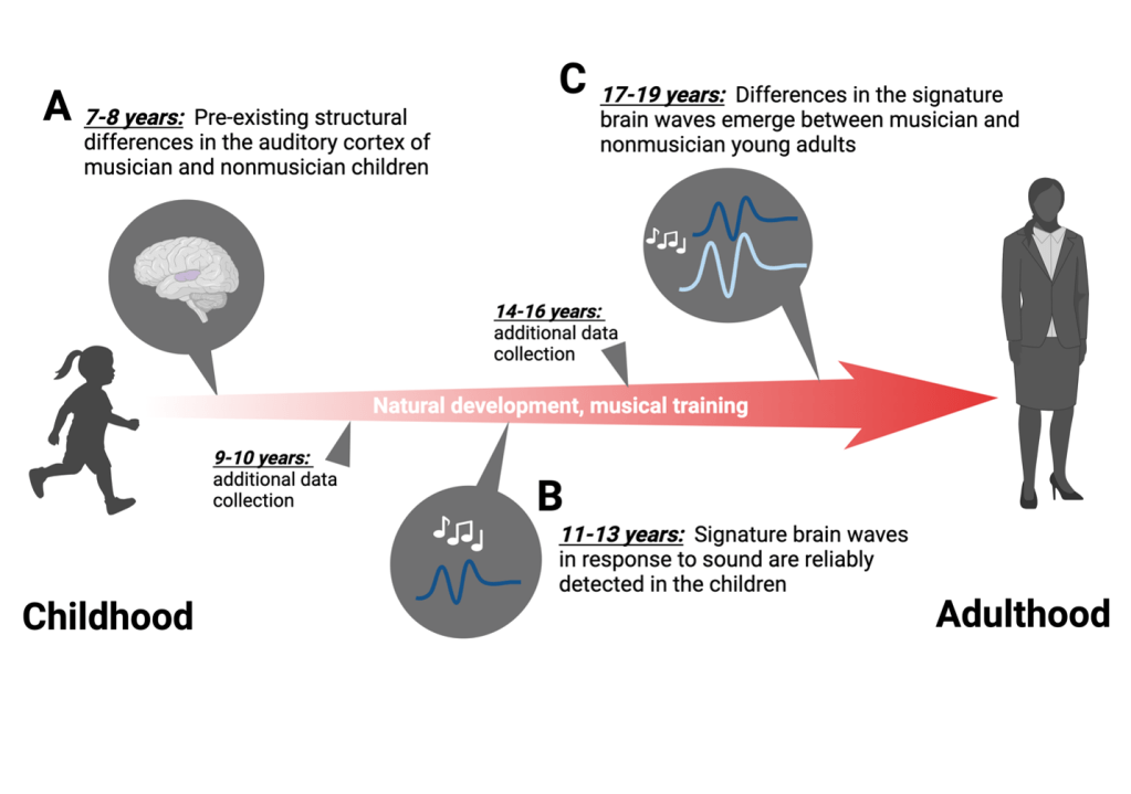 Because many adult musicians began training as young children, it is often difficult to distinguish between nature and nurture when studying the brains of adults. To solve this problem, a team of researchers in Germany and Austria collaborated on a longitudinal study that followed children through adolescence and into early adulthood1. In a longitudinal study, measurements are collected repeatedly at several different times to better understand how conditions evolves over time. The researchers started following children when they were 7-8 years old, collecting data on them every 2-3 years until they were 17-19 years old – five time points in total (Figure 1).