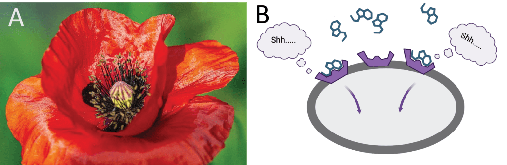 Opioidsare chemicals that come from the opium poppy plant (Figure 1A), or that have similar effects on our body as those that do. Specifically, opioids share a shape that fits into opioid receptors. Receptors are a kind of cellular machinery that sit on the surface of cells and communicate messages from the outside world (Figure 1B). In the case of opioids and their receptors, that message is: “quiet down!”2