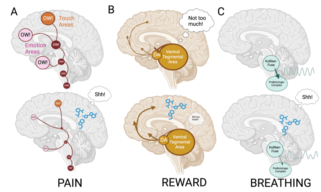 When you think of breathing, you probably think about your lungs. But the nervous system also plays a key role in breathing. Opioid receptors in a part of the brain called the brainstem are probably the culprit for the drugs’ breathing disruptions. Two brainstem areas that control breathing are particularly packed with opioid receptors. The first is called the PreBötzinger complex, and it produces a steady breathing rhythm for us in response to how much oxygen we are using.8 The second area is called the Kolliker-Fuse nucleus, and its activity keeps that rhythm steady (Figure 2C). Together, they work together to make sure we are taking in enough oxygen to keep us alive and feeling good.