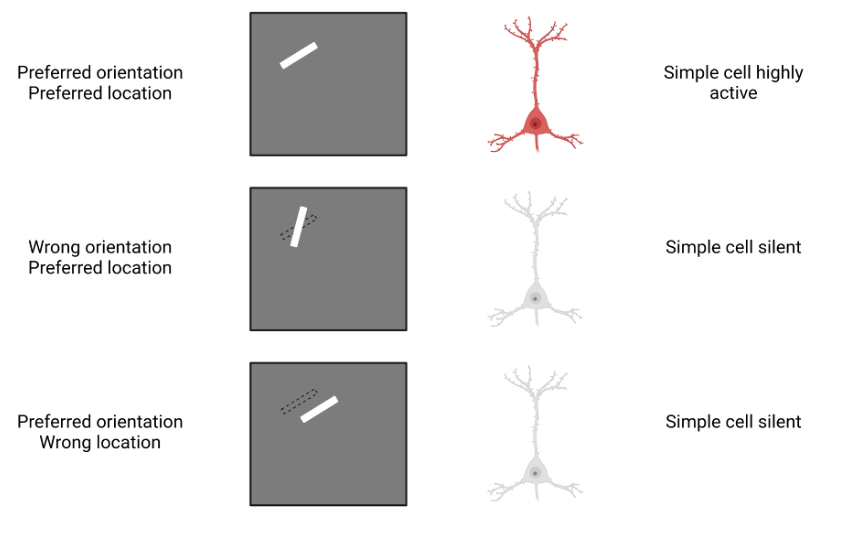In a series of experiments hammering down this finding, they discovered that many neurons in the cortex responded vigorously when a rectangular bar of light oriented at a specific angle was displayed2,3,6–8. Each of these neurons, which are now called simple cells by neuroscientists, preferred different bar orientations and different locations on the screen. If a bar was shown either in the wrong location or at the wrong orientation, each simple cell would not activate (Figure 2). Between the countless simple cells in this region of cortex, all orientations and spatial locations are well represented. Hubel and Wiesel found another class of neurons in this region that are now called complex cells. For the most part, complex cells also prefer rectangular bars of light at specific orientations. In contrast to simple cells however, many complex cells respond strongly to the oriented bar over a wide region of space on the projector. Some complex cells are even only responsive if the oriented bar is actively moving in a specific direction. (Here is a video demonstrating the responses of these neurons in real time – the clicking sounds that can be heard is the sound of the neuron activating).
