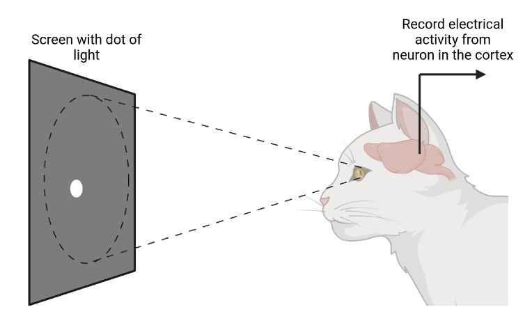 In the latter half of the decade, two young neuroscientists tackled this seemingly impossible challenge with a determination to match. In their experiments examining how the brain constructs our visual experience, David H. Hubel and Torsten N. Wiesel recorded the activity of neurons in cats while the cats viewed a screen that displayed small dots of light6,7 (Figure 1). By this point, other scientists had found that single neurons in the eye were strongly activated by a small dot of light displayed on a specific part of the screen3. Importantly, these neurons only responded when light was just within that specific dot – putting the dot of light somewhere else or making the whole screen light up failed to activate those specific neurons. Neurons responding in this way were also found within the thalamus, a structure deep within the brain that (in part) relays visual information from the eyes to the cortex, the large, wrinkled structure that covers the top of almost the entire brain. The cortex is where the most sophisticated processing of visual information occurs.