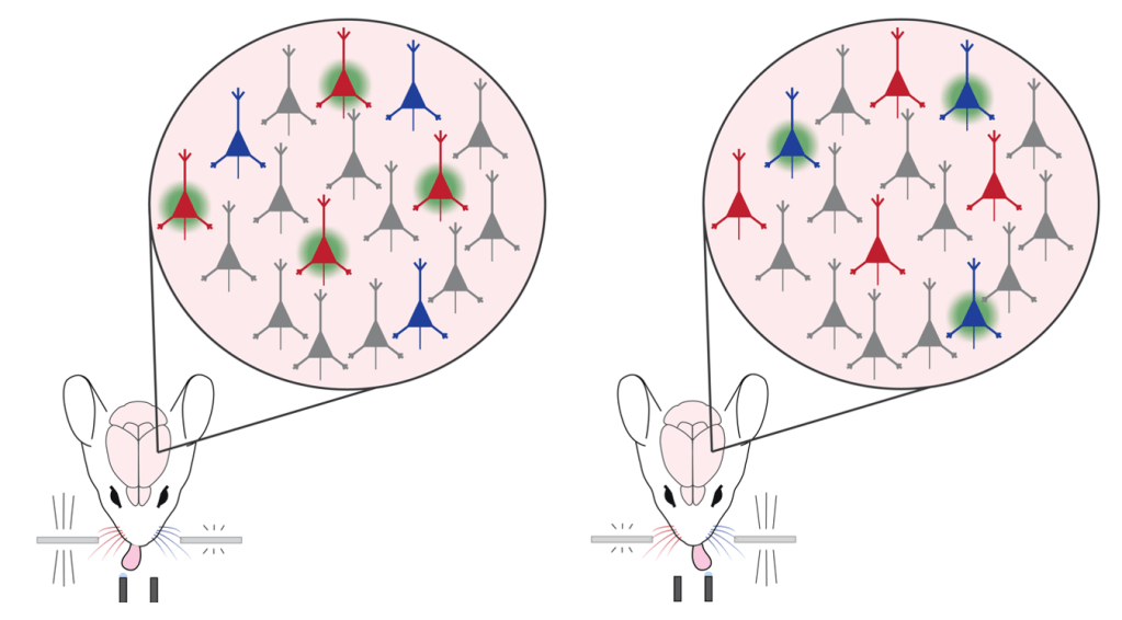 These powerful techniques have been optimized for use in mice, who are one of the mostly widely used animal species in neuroscience. But this means that Gauld and his colleagues had to come up with a way to test sensory perception in mice, who can’t simply tell us when they’re experiencing a sensation. Mice rely heavily on sensation with their whiskers as they navigate through tight spaces, often in the dark. Therefore, they devote a significant amount of real estate in their brain to whisker sensation, where there are particular neurons that are activated when the mouse’s individual whiskers are moved.3 To get a mouse to report their whisker sensation, the scientists trained the mice on a task where they moved the whiskers on both sides of the mouse’s face, then had the mice had to report whether their right or left whiskers were stimulated more strongly by licking one of two water spouts (Figure 2).