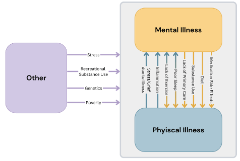 We know from years of research that body and brain health affect each other in a lot of complicated ways (Figure 1). Some might be more easily traceable – for instance, many medications used to treat schizophrenia have side effects that include severe weight gain or heart problems3. Others are more complicated, like the theory that an overactive immune system can cause problems like depression4.