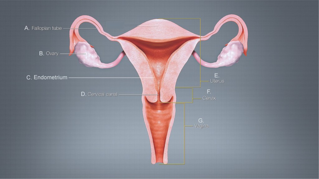 First, it’s important to understand that though endometriosis affects approximately 1 in 10 people with uteruses2, not everyone with severe period pain has endometriosis. To understand this specific condition, we must break down the anatomy of the typical female human reproductive system (Figure 1). The uterus (Figure 1E) stores eggs in its walls, or lining, called the endometrium (Fig 1C). Every month (typically), these eggs either get fertilized by sperm, or shed and exit the body through menstrual blood.