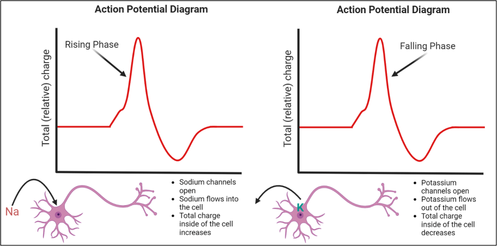 Altogether, the features that we have described now set the stage for an action potential to occur! When the neuron undergoes an action potential, sodium channels (but not potassium channels) open which allows sodium to flow into the cell. Why do sodium channels open first and not potassium? You can think of sodium channels as being a really fast and sensitive automatic sliding door and potassium channels as being a very slow and less sensitive automatic sliding door. Since sodium is a positively charged particle and sodium channels have opened, sodium flows into the cell, increasing the amount of positive charge in what is called the “rising phase” of the action potential (Figure 3, left). After some time passes, sodium channels close and potassium channels open. Potassium flows out of the cell and, since potassium is also a positively charged particle, this decreases the amount of positive charge inside of the cell and results in what is called the “falling phase” of the action potential (Figure 3, right).
