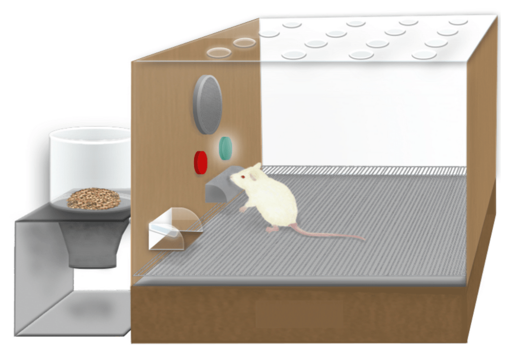 In order to maintain control of their followers, cult leaders need to reinforce the beliefs of the cult repeatedly. To do this, cults often use a tool called operant conditioning that is borrowed from classic animal behavior studies7. Operant conditioning was developed in the mid-20th century by B.F. Skinner, and is a method of learning that uses rewards and punishments to teach someone to increase or decrease a specific behavior. To understand operant conditioning, imagine a mouse in a small chamber with a green light, a red light, a lever, and a dispenser filled with (delicious!) cookies. Initially, the mouse explores the chamber without understanding the connection between the lever, the light, and the cookie dispenser. The mouse is gradually taught to associate pressing the lever with receiving a cookie. This process often involves shaping, where any action close to the desired behavior—such as moving toward the lever—is rewarded to encourage further interaction. Eventually, the green light is introduced as a cue. When the light turns on, it indicates to the mouse that pressing the lever will now release a cookie (Figure 2). The mouse learns to associate the green light with the opportunity for a reward, and will increase lever pressing when the green light is on.