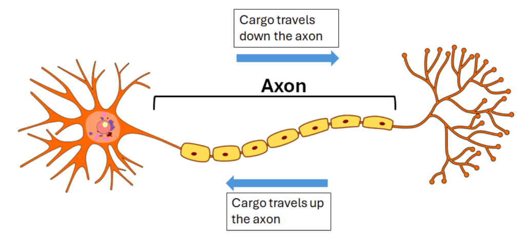 Imagine if there was a world-wide shutdown of the transport and delivery of goods. It would be chaos! We’d have empty store shelves, limited medical supplies, and less available car parts. Not to mention, it would be very frustrating for anyone eagerly waiting for a package to be delivered. Did you know that this idea of transport also applies to neurons? Neurons are special cells that help us to interact with the world (Figure 1). They communicate with each other in our nervous system to help us experience smells, taste, hugs, and great music. Supporting these tiny heroes is a vast transport network called axonal transport1, that delivers much needed supplies throughout your neurons so they can keep working all day long. Axonal transport works much like a typical transport and delivery system: you have roads, cargo trucks, shipping labels and GPS navigation. It’s so cool that neurons use the same tools as UPS to deliver their cargo! Let’s explore the role of each of these key players in the neuron delivery system and how they work together to keep the brain working.