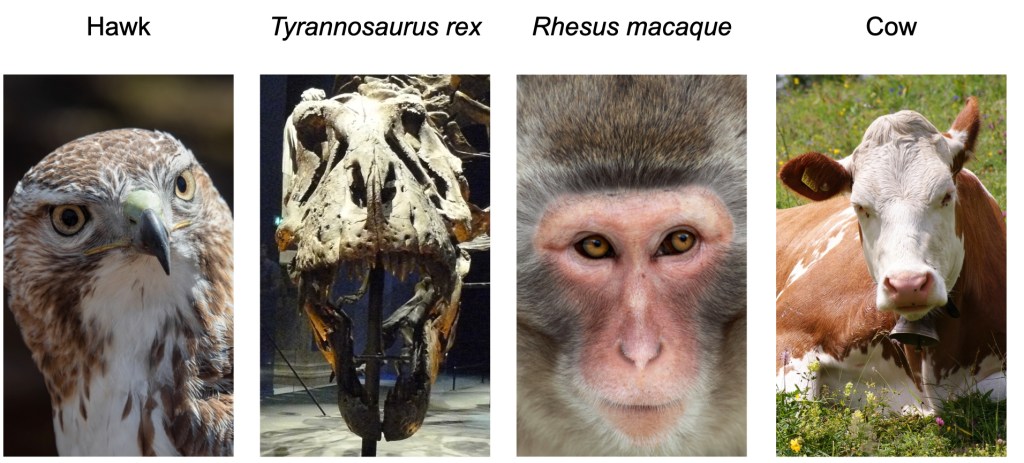 Just like brains, dinosaur eyes aren’t preserved for millions of years, but some of their features can be determined from their skulls. For example, for many animals with two eyes, both eyes view overlapping parts of the world. This overlap is called the binocular field (you can test this by alternately closing each eye and observing how much of the same thing you see in each eye alone). Eyes that are front-facing and closer together tend to have larger binocular fields. Animals with larger binocular fields, like humans and birds, have better depth perception than animals with smaller binocular fields, like cows (Figure 3). Dinosaurs like Tyrannosaurus and Velociraptor had two front-facing eyes that were close together, suggest that their depth perception was similar to or even better than modern birds of prey like hawks9. Understanding a dinosaur’s depth perception can help paleoneurologists guess at what kinds of hunting styles they may have used.