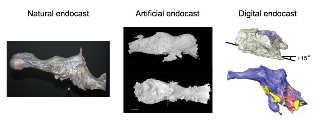 Since there aren’t any living dinosaurs running around (RIP Jurassic Park) we can’t use the same methods to study dinosaur brains that we do in the rest of neuroscience. Instead, paleoneurologists rely on molds and images of the inside of a dinosaur skull, called endocasts (Figure 1), to get an idea of the brain’s relative shape and size2. Sometimes, endocasts are formed naturally when exactly the right conditions cause a dinosaur’s skull to fill with materials that fossilize and preserve its shape2 (Figure 1, left). Such natural endocasts are rare, so early paleoneurologists also developed methods to make their own by filling dinosaur skulls with materials, like rubber or silicon, that conform to the shape of the skull before hardening3 (Figure 1, middle). However, this method risks damaging already precious specimens, often requiring the skull to be intentionally broken, and only certain skulls can be used2. Today, endocasts are made using the same scan doctors use to visualize the inside of patient’s bodies, a method called a computed tomography (or CT) scan2 (Figure 3, right). These digital scans don’t harm precious fossil skulls and allow paleoneurologists to quickly and easily create and share many more endocasts.