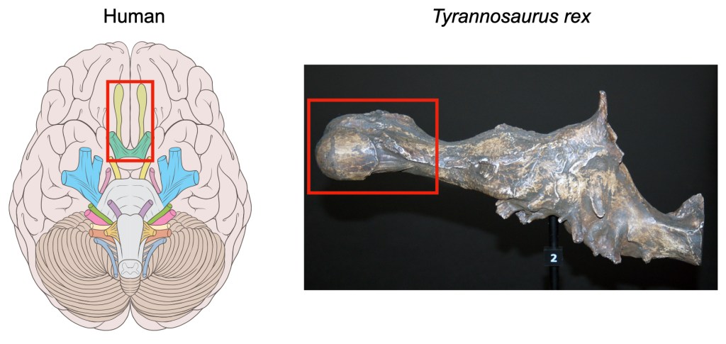 Animals have a specialized part of the brain that reaches down toward the nose, which is responsible for processing molecules in the air and turning them into our sense of smell, called the olfactory bulb (Figure 2). The bigger an animal’s olfactory bulb, the more an animal is thought to rely on smell. Paleoneurologists have used this relationship to make educated guesses about how much different species of dinosaurs relied on smell. For example, Tyrannosaurs had relatively large olfactory bulbs and are thought to have used smell when scavenging, whereas other dinosaurs like Oviraptorosaurs and Ornithomimisaurs have smaller olfactory bulbs and are thought to have relied more heavily on sight, similar to modern birds2. Understanding a dinosaur’s sense of smell gives information not only about how much they may have used smell to hunt, but whether they could have used smell to recognize kin or engage in paternal/maternal behaviors, giving insight into social structure.
