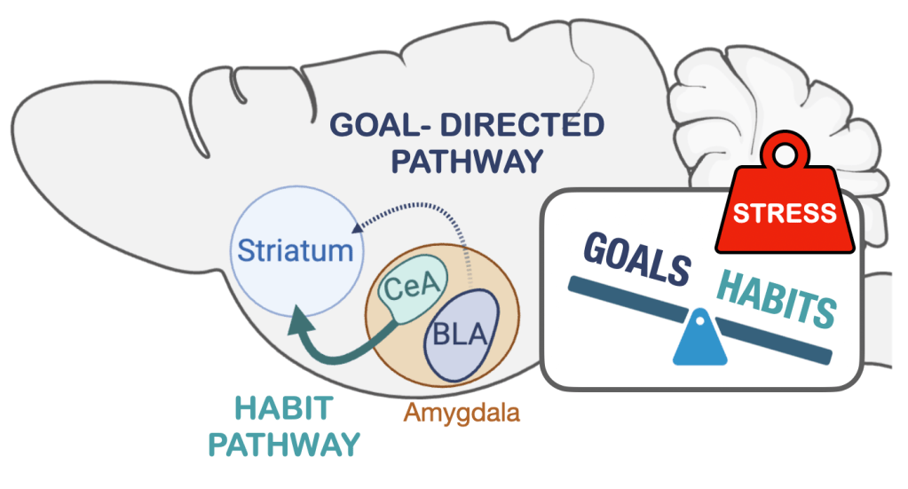 The ability to make decisions and adjust our behavior involves many brain regions. However, in a study published last month, scientists at Temple University in Philadelphia proposed that two brain pathways are particularly important for balancing what’s best (i.e., goals) and what’s easiest (i.e., habits).1 Both pathways begin in one brain region called the amygdala and end in another brain region called the striatum. Similar to how you might give directions based on where to enter and exit a highway, neural pathways are named by where they begin and end. So, these two neural highways from the amygdala to the striatum are called amygdala-striatum pathways. One amygdala-striatum pathway, which extends from the basolateral amygdala (BLA) to the striatum, is thought to support goal-directed behavior while the other pathway, which travels from the central amygdala (CeA) to the striatum, is thought to support habits (Figure 1). Because behavior is always happening, we can think of these two amygdala-striatum pathways as always being “on.” As such, the striatum is constantly “weighing” activity from each pathway and selecting actions accordingly.2  If there’s more activity coming along the BLA-striatum neural pathway, goal-directed actions, like choosing to keep your phone out of the bedroom, win out. More activity in the CeA-striatum pathway? You’ll probably find yourself back in the habit of scrolling before bed. During everyday life, the behavioral balance scale tips to and fro, allowing for a flexible range of actions that span the spectrum between goal-directed and habitual.