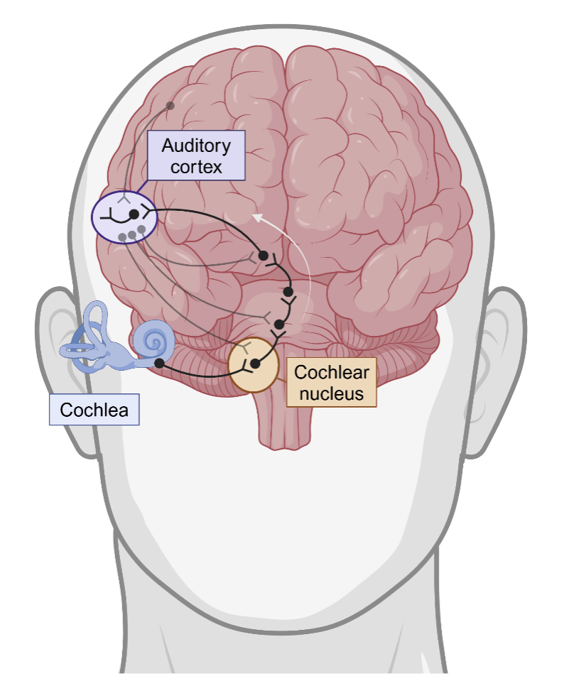 Before we can talk about what is happening in the brain during tinnitus, we first need to talk about how the brain turns sound waves into the experience of hearing a sound (Figure 1).1 When something produces sound waves in the environment, your ears funnel those sound waves onto a structure in your ear called the cochlea. The cochlea, whose name comes from the Latin word for snail shell because of its distinct spiral structure, has cells along this spiral that are activated by sound waves. These cells translate sound waves into electrical signals that the brain can understand. But these signals must pass through several waystations before they reach the part of the brain that creates the feeling of a sound. The first waystation is a part of the brainstem called the cochlear nucleus, which does some basic processing of the sound. The sound then passes through a few more waystations in the brain until it finally reaches the auditory cortex. It’s the cells in the auditory cortex who are responsible for creating the actual “feeling” of what it is to hear a sound.