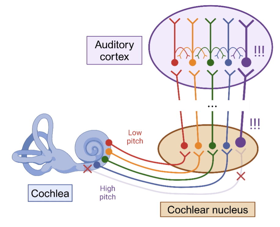 Even though we have a decent understanding of the ways in which the brain processes sounds, how exactly these mechanisms can be hijacked to produce chronic tinnitus has not yet been sorted out. Nevertheless, over the last few decades doctors and neuroscientists have been combining observations in patients with experiments performed in the lab to form theories about how changes in the brain cause tinnitus.2,3 The most important observation is that almost all patients who go on to develop chronic tinnitus already had some degree of hearing loss.4 These patients can have hearing loss for a number of reasons, but the most common causes are simply aging or exposure to loud noises. It’s somewhat counterintuitive that hearing loss would leads to hearing more sound in one’s head in the form of tinnitus. But because the association of tinnitus with hearing loss is so strong, researchers hypothesize that tinnitus is the result of brain circuits adapting to being fed less sound. This hyothesis is bolstered by additional observations about the pitch of the tinnitus. For most people that have hearing loss, their hearing loss is worse at certain pitches than other. (For the majority of people, hearing loss is most severe at te highest pitches because the high pitch cell in the cochlea are closest to its opening). Interestingly, many patients report that their tinnitus sounds like the exact frequency where their hearing loss is the worst.5