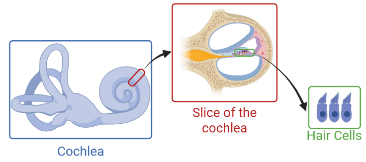 Before we can dig into how a cochlear implants works, it is important to first understand the area that is targeted – the cochlea. The cochlea is a round, spiral-shaped structure located deep inside your ear that is essential for hearing sound (Figure 1). The name ‘cochlea’ comes from the Latin word for snail shell in reference to its coiled shape. Inside of the cochlea is a long strip of tissue that follows along the coil-shaped cochlea. Location on this strip of tissue are cells known as hair cells that are responsible for sending sound signals to the brain.