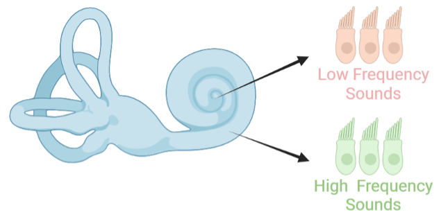 Importantly, hair cells send different kinds of sound information to the brain, depending on where the hair cell is located in the cochlea (Figure 2). Hair cells located on the outer parts of the cochlear spiral send information about high frequency sounds, like a referee blowing a whistle or a bird chirping, to the brain. Hair cells located on the inner parts of the cochlear spiral send information about low frequency sounds, like the rumble of thunder or music from a bass drum, to the brain. The sounds that we hear in our everyday lives are often a mix of high and low frequency sounds. This means that in normal hearing, lots of hair cells will be active across the cochlear, depending on the sounds we are hearing.