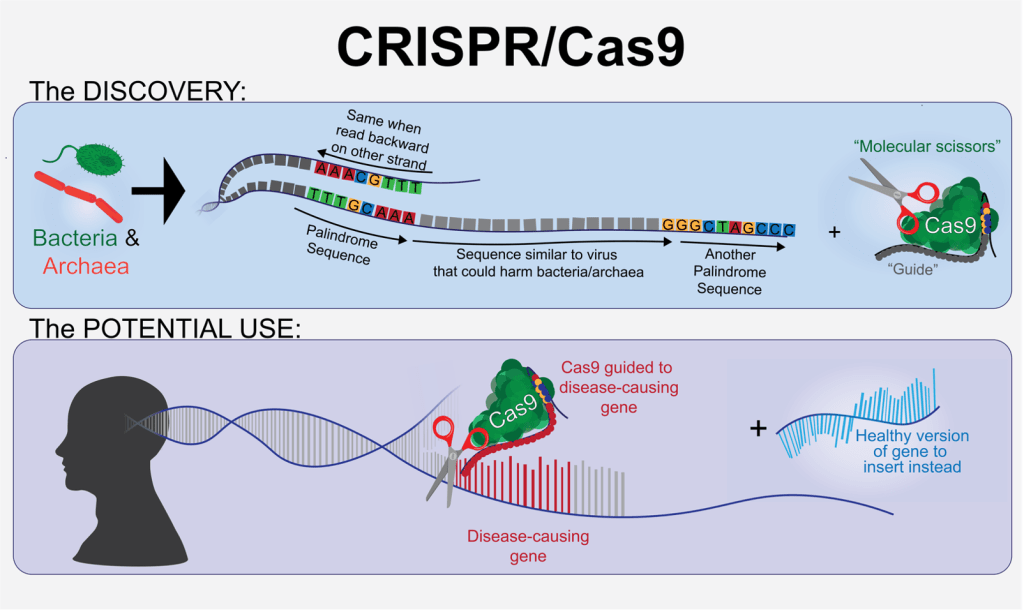 This discovery sparked several groups’ interest in a basic question- exactly how do single-celled organisms like archaea fend off infections? Although it is certainly far removed from the very complex human immune system, several researchers became fascinated with understanding this on a deeper level. Further research clarified that the way this (literally) archaic, miniature immune system works is by collaborating in tandem with another molecule named Cas9. Cas9 functions kind of like molecular scissors; the DNA containing the alternating palindrome sequences and sequences resembling viruses act as guides used to recognize possible invaders, and Cas9 uses these guides to identify invading viruses, which it can then cut up and destroy4.