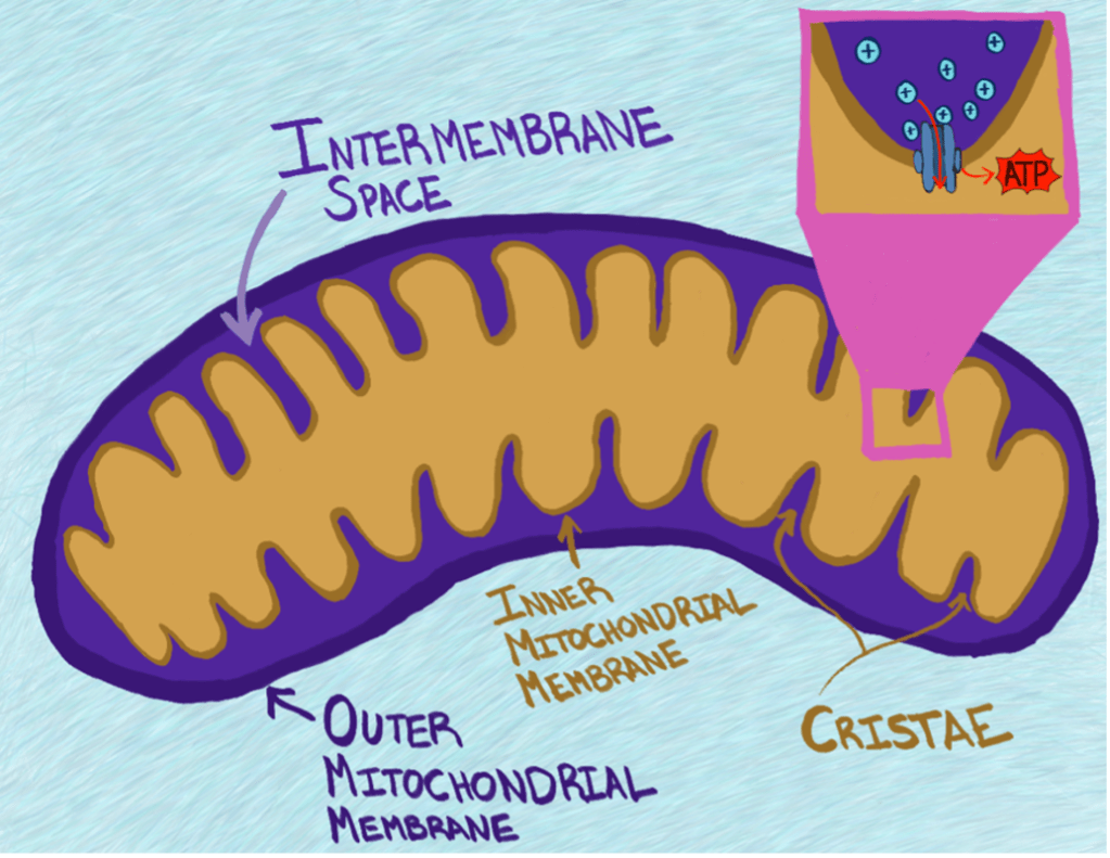While most textbooks provide an oversimplified picture of mitochondria, they do accurately capture a key structural feature: mitochondria have two separate layers of fat that protect the inside of the organelle from the outside cellular environment. These layers of fat are called membranes The membrane on the outside, called the outer mitochondrial membrane, is the smooth structure that is large enough to be seen in microscope images like Figure 1. The membrane on the inside, intuitively called the inner mitochondrial membrane, is crinkled up into a groovy layer of fats. These grooves are so important to the structure of mitochondria that they have their own special name- cristae (pronounced kris-tay; Figure 3). The inner mitochondrial membrane contains the many little molecular machines that do the mitochondrion’s most famous job of producing energy in the form of a chemical called Adenosine Triphosphate (ATP). This ATP can be used by other molecular machines in the cell to power the hard job of staying alive and healthy.