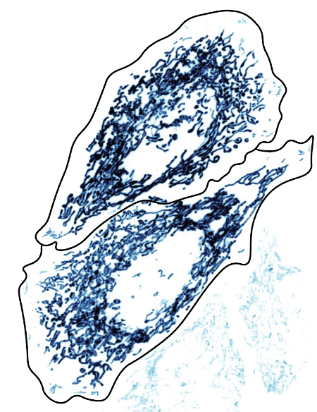 Biology textbooks tend to picture mitochondria as one or two little kidney bean-shaped structures with what looks like a squiggle on them. In reality, mitochondria exist in cells as an extensive, inter-connected network that is constantly being molded and reshaped to adapt to what a cell needs (Figure 1). When healthy and functioning, mitochondria are elongated, tube-like structures that resemble spaghetti. When damaged, this network becomes fragmented, and the remaining pieces of mitochondria become isolated, spherical structures (Figure 2)1.