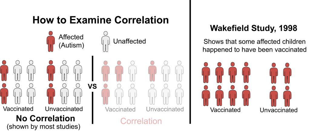 Even before all of Wakefield’s misdeeds came to light, there were still many glaring problems with study. First, twelve is an incredibly low number of participants for this kind of research. Studies that followed this one looked at hundreds, if not thousands, of children11–13. Second, they did not include proper controls. To prove the trend suggested by the authors, that vaccines correlated with autism, they would have needed to show that vaccinated children developed autism more frequently than unvaccinated children, as represented in the center panel of Figure 1 below. Instead, since their group only looked at children with developmental delays, what the authors showed is that of those twelve children, eight happened to have received the MMR vaccine (Figure 1, right). Finally, the study claims that children showed signs of developmental delay within weeks, if not days, of receiving the vaccine. Given the short amount of time between vaccination and symptoms arising, the more likely reason for these observations is that the MMR vaccine is typically given around the same time that developmental delays become noticeable14.