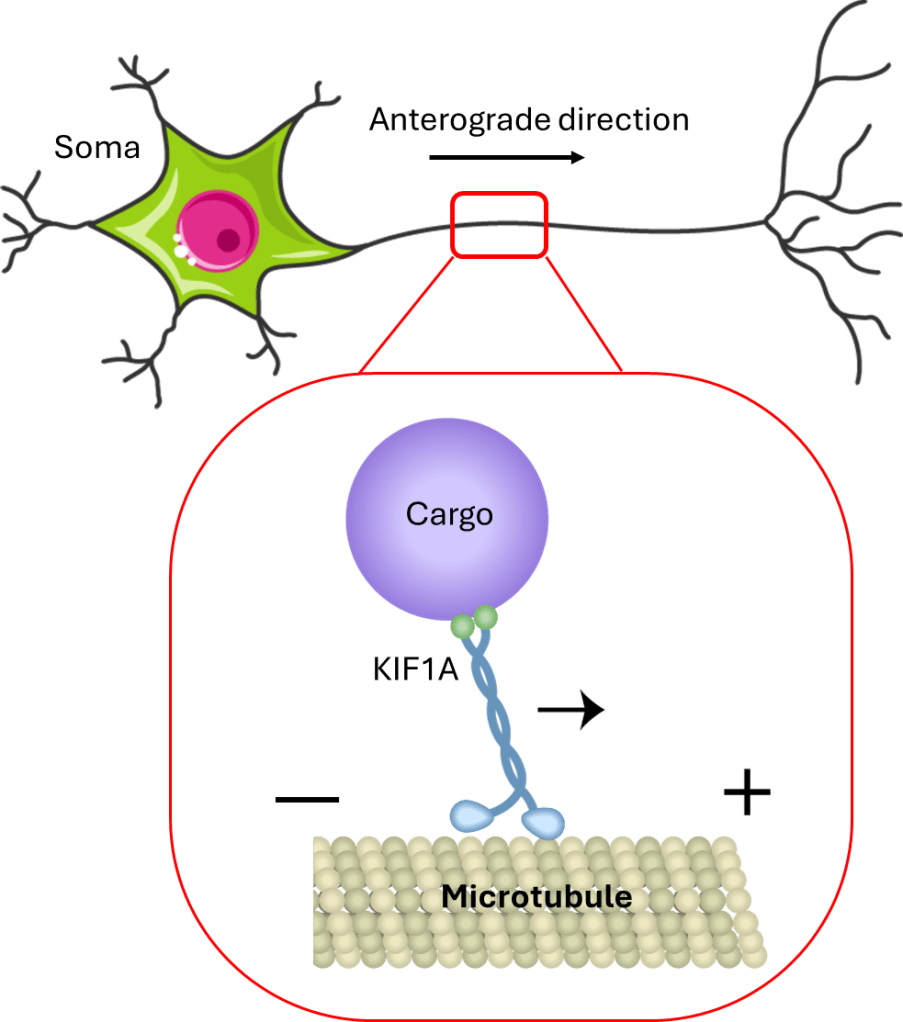 KIF1A is a kinesin motor protein that “walks” along the axon’s roadway, which is made of a material called microtubules, to deliver materials. KIF1A moves cargo down the length of neurons, but interestingly it only moves it one direction! It moves material from the body of the neuron (the soma) to the far end of the axon – which is called anterograde transport (Figure 1). KIF1A is mostly known for transporting supplies that are important for neuron-to-neuron communication, but recent work suggests that KIF1A also transports supplies that are important for a number of other vital processes1,2,3.