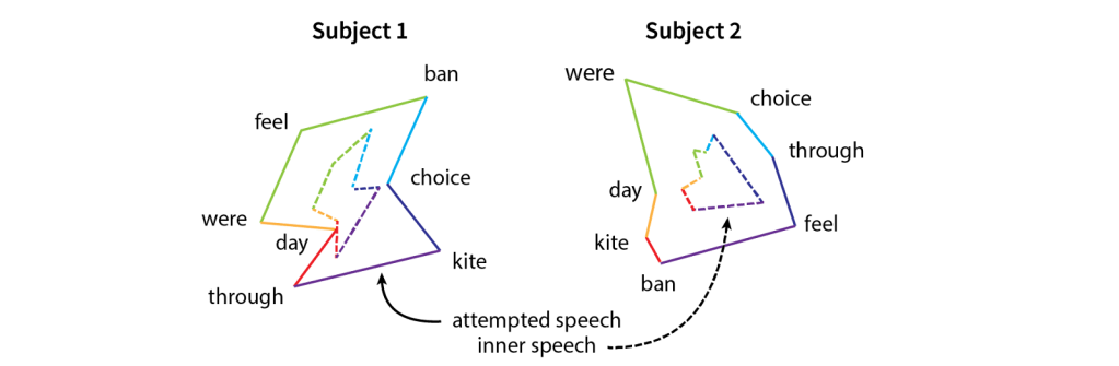 To find out, the researchers designed a task to compare attempted and inner speech. Participants saw a word appear on a computer screen and were instructed either to speak it or to imagine speaking it using their inner voice. Researchers then looked at whether motor cortex showed different patterns of brain activity for each word and whether these patterns were similar between the two conditions. Excitingly, they found that the patterns of activity were similar for attempted and imagined speech. However, the strength varied between conditions with inner speech producing a smaller (i.e., weaker) version of attempted speech —as if the brain plays the same “tune” for each word, but turns down the volume for inner speech. (Figure 2). This shared structure implies that if a BCI can decode attempted speech, it should also be able to decode inner speech.