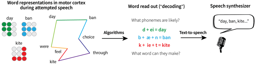 There are millions of people living with conditions that limit their ability to move and speak, like amyotrophic lateral sclerosis (ALS), stroke, or paralysis.1 It’s been a longstanding priority of researchers and engineers to use available technology to help these individuals feel less isolated by finding ways to preserve or restore their ability to communicate. Stephen Hawking’s communication system is one well-known example. Due to ALS, Hawking lost most of the muscle movement needed for speaking and he communicated with the help of a computer system where a cursor scrolled constantly across letters and words organized on the screen. By pressing a button with his finger, Hawking could stop the cursor and select what he wanted to say. Piece by piece, he assembled sentences, which were then read aloud by a speech synthesizer. As his disease progressed and his hand weakened, Hawking’s system was upgraded to be controlled by subtle movements of his eye and cheek muscles (Video 1). However, these muscles also eventually weakened and even eye-controlled communication became difficult. While revolutionary for helping preserve Hawking’s voice and ability to interact with others, the process of interfacing with the computer was both time consuming (Hawking selected each word one at a time) and required some amount of physical movement, which became increasingly difficult as the disease progressed.
