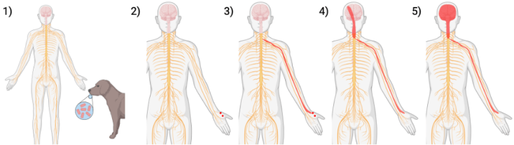 Before rabies can affect behavior, it has to travel from the bite wound to the brain. But the body protects the brain from diseases using the blood brain barrier, which stops harmful things like diseases from crossing over from the bloodstream to the brain. How does rabies bypass this protective barrier? Instead of trying to cross the well-protected path from blood vessels to the brain, rabies uses an alternative route: it travels along nerves. This “nerve pathway” is much less protected than the blood brain barrier – the nerves in your brain need to communicate with the nerves in your body, which means particles need to move freely between the two. The rabies virus takes advantage of this vulnerability by infecting nerves directly. First, rabies infects nerves in your body, such as the motor nerves that let you move your muscles10. These motor nerves are controlled by a series of nerves connected one to the next between the brain and body. Once the motor nerve is infected, the rabies virus works backwards, infecting the nerve that tells the motor nerve what to do, then infecting the nerve that tells that one what to do, and so on. By working backwards like this, rabies makes its way to the spinal cord, then works its way upwards until it reaches the brain (Figure 1).